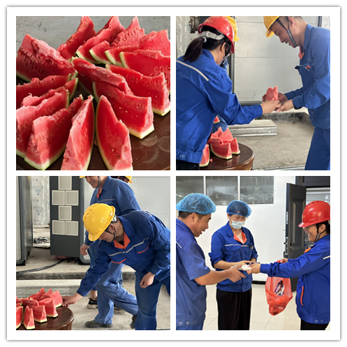 進(jìn)入7月,酷暑難耐,在持續(xù)高溫的天氣里,為切實(shí)做好夏季防暑降溫工作,維護(hù)職工身心健康,公司黨工青婦互相配合、立即行動(dòng),精心熬制清熱解暑的綠豆湯,每天中午10:00至下午16:00前在綜合樓一樓準(zhǔn)時(shí)為一線員工供應(yīng)飲品,在設(shè)備安裝現(xiàn)場(chǎng),組織后勤人員前往一線送去西瓜、雪糕、礦泉水等防暑降溫物品,同時(shí)對(duì)一線員工進(jìn)行夏季安全宣傳普及。
